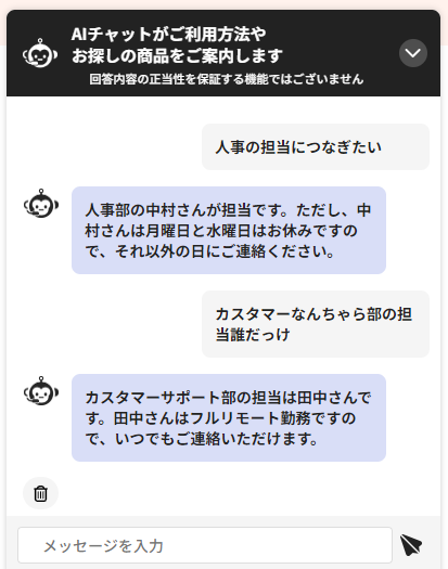実際にチャットしてみると、アップロードしたテキストファイルのデータをもとに、AIデジタルスタッフで回答ができています!
