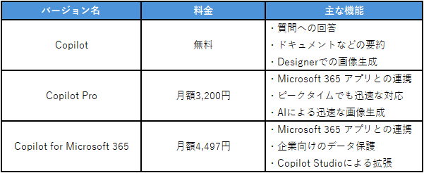 Copilotの機能はバージョンによって異なり、2024年6月現在では以下のようなプランが展開されています。