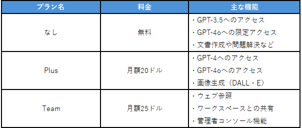 ChatGPTについても、利用用途に応じた3つのプランが用意されています。