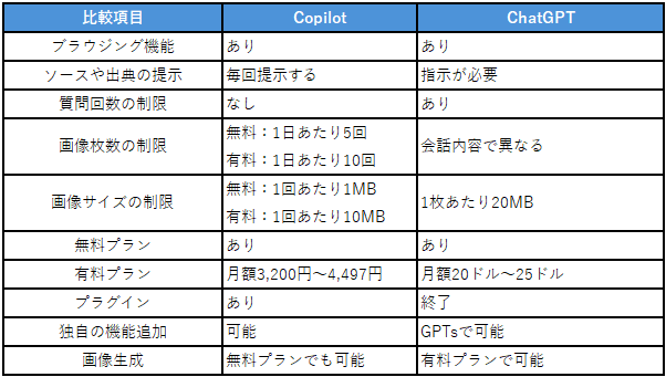 Copilotは毎回ソースを表示し、無料プランでも回数制限付きで画像生成が可能なのに対し、ChatGPTはソース提示に指示が必要で、画像サイズ上限が大きく独自機能(GPTs)も使えますが、画像生成には有料プランが必要です。(※2024年6月25日現在の情報です。今後のアップデートなどにより、サービスの仕様は変わる可能性があります。)