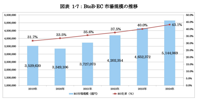 2024年時点で約514.4兆円と、BtoC市場の約19倍にもなる巨大な市場です。EC化率も年々高まっており、今後も成長が見込まれる注目の分野です。