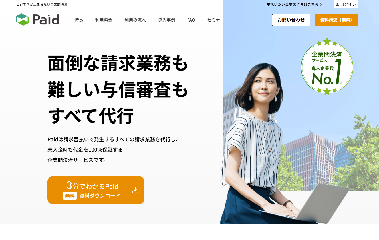 4,500社以上に導入されている掛け払い決済サービスです。事業者が取引先の情報ならびに請求情報を登録するだけで、請求に関する業務をPaidが全て代行して行う仕組みになっており、APIとの連携により請求業務の全自動化を実現させることもできるという特徴があります。