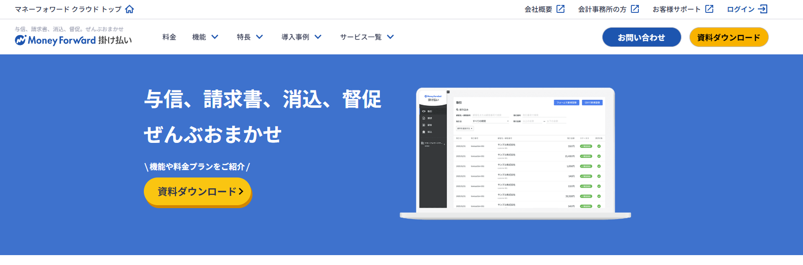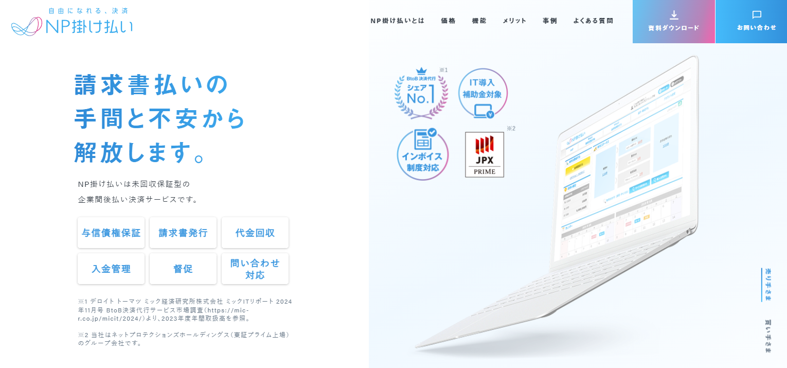 与信審査・請求書発行・入金管理・未入金時の督促などを代行して行い、BtoB事業者の業務効率化に貢献できるサービスです。