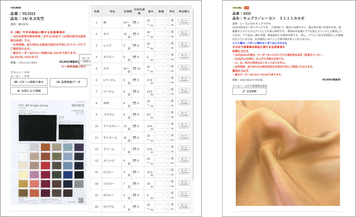 卜部氏:「取り置き機能」「サンプルオーダー」「商品詳細の見せ方(単位)」は構築当時から叶えたかった事で、生地業界の商流に沿った形でこれらの機能は実現し「Fably(ファブリー)」は作られています。