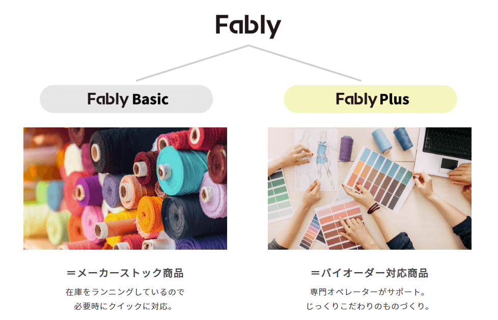 それをどうやってお客様にわかりやすく使い分けてもらえるかというところで、在庫を積みストックがあるものを「FablyBasic」、注文が来てから作る受注生産分を「FablyPlus」としてわかりやすく伝えるためにこういった分類の概念を作りました。