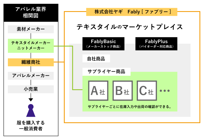 日本の繊維産地はすごく品質やクオリティの高い商品を作っていますが、直接売る仕組みやお客様との接点が持てていないという実情がありましたので、いいものを作っているメーカーさんをより広く認知してもらう場所として「Fably(ファブリー)」を使ってもらえるようプラットフォーム化しています。