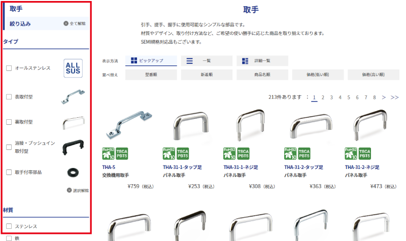 例えば、取手であれば「タイプ」「材質」「取手ピッチ」「高さ」「ねじ径」「垂直許容荷重」「型式」「色調」「SEMI規格」「適応機種」「難燃性」「機能」から商品を絞り込むことができます。