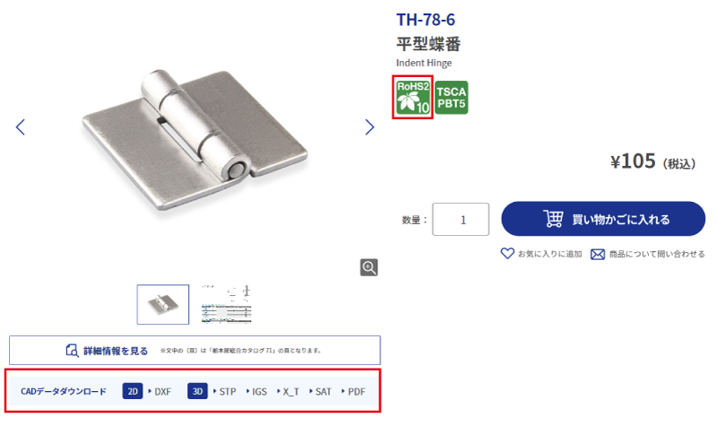 Aカート機能だけではない、データダウンロードや型番比較ができる商品詳細