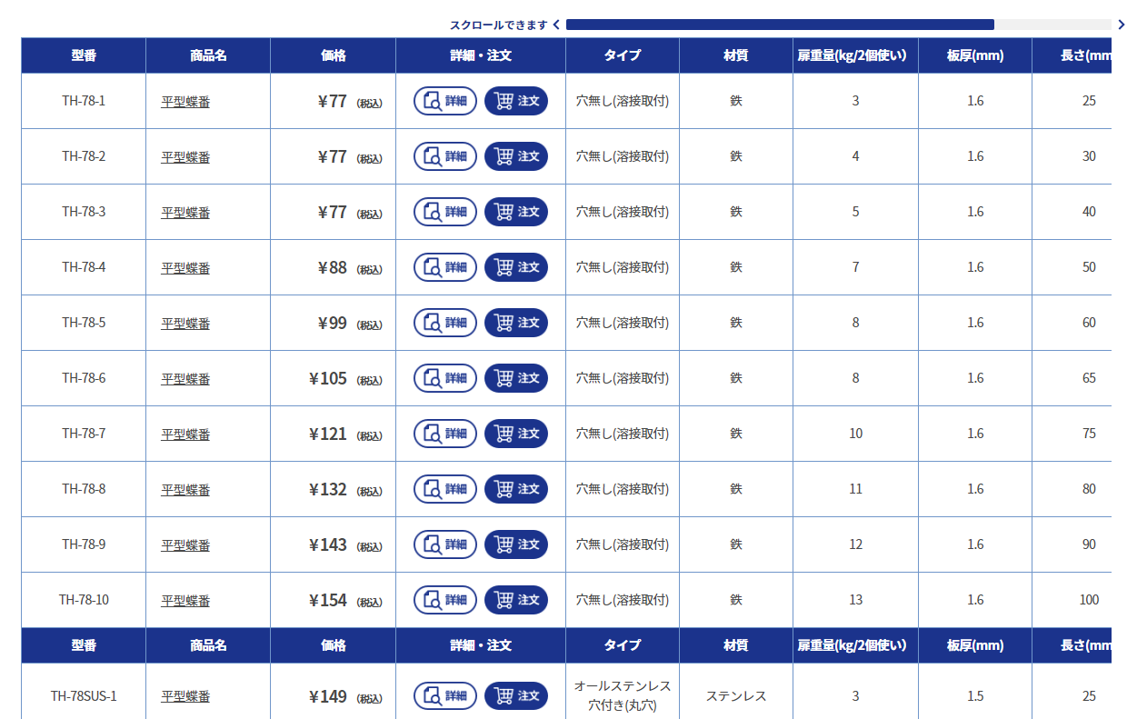 また別の品番の商品と比較したい場合、商品詳細下部の比較表にて長さや重さ、材質、金額などのスペックを一覧で比較することができます。