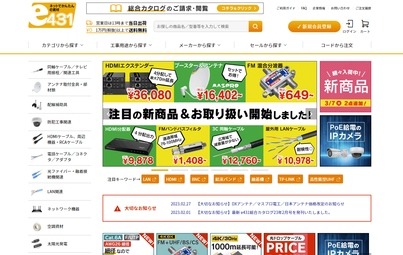 通信関連⼯事‧テレビ関連⼯事‧電気⼯事などの⼯事業者を対象としたECサイト運営をしている株式会社e431は、工事に必要なケーブルやコネクターなどの⾃社開発商品および国内外のメーカー製品を4,000点以上取り扱っています。