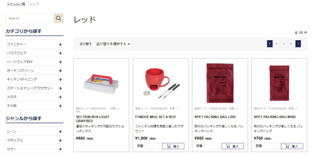 ブライダルやアウトドア、DIYなどの商品の使用イメージに合わせた「シーン別」、メタルやガラス、プラスチックなど素材で探せる「マテリアル」、お客様によっては、『今年のクリスマスは黄色い商品だけのエリアを店舗に設けたい』『赤い新色の車を発売するため、赤い車に合わせたノベルティグッズを用意する必要があり、赤い商品だけをピックアップしたい』などの要望にも応えられるよう「カラー」でも探せれるようにしています。