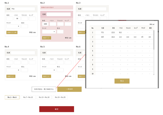 サイズの採寸は先生が教室で行っているのですが、欠席の生徒さんがいると全員のサイズを一度に測ることができないことや、揃っていても入力途中に確認事項が発生することがあるため、入力事項の一時保存機能も導入しています。
