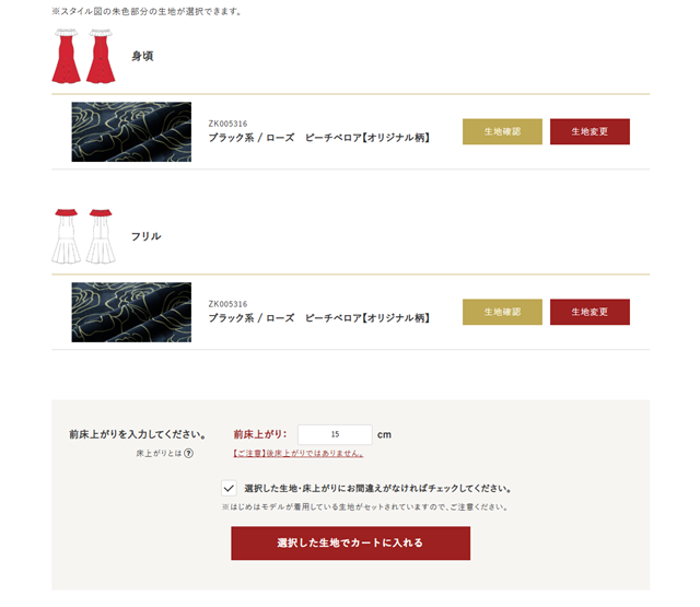 そのため、お客様がドレスの型や生地、「床(ゆか)あがり」などをサイト内で自由にカスタマイズして注文するという工程を実装する必要があります。ecbeingは他社でもカスタマイズ商品の取り扱い事例が豊富にあり、ドレスの型や生地、サイズなど、複雑なBTO商品にも柔軟に対応できると思い、ecbeingでの実装を決めました。