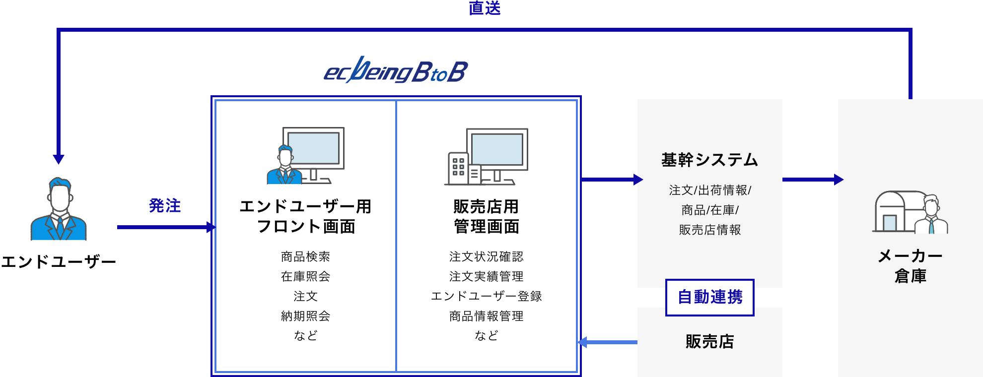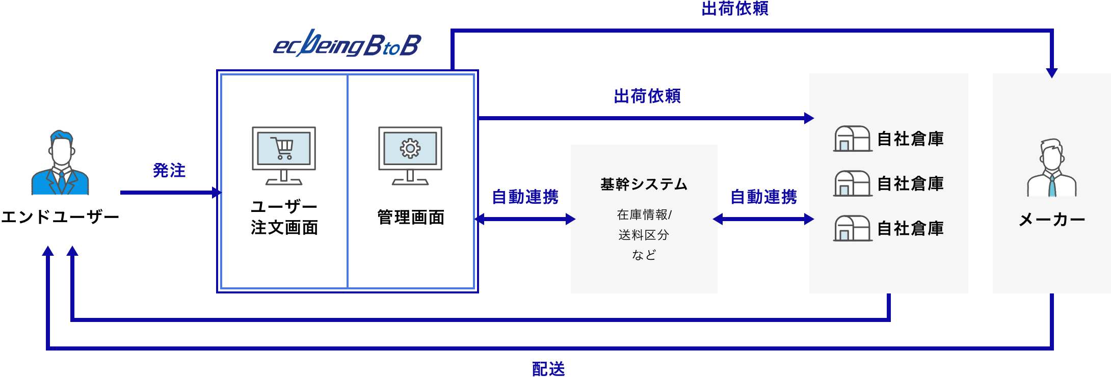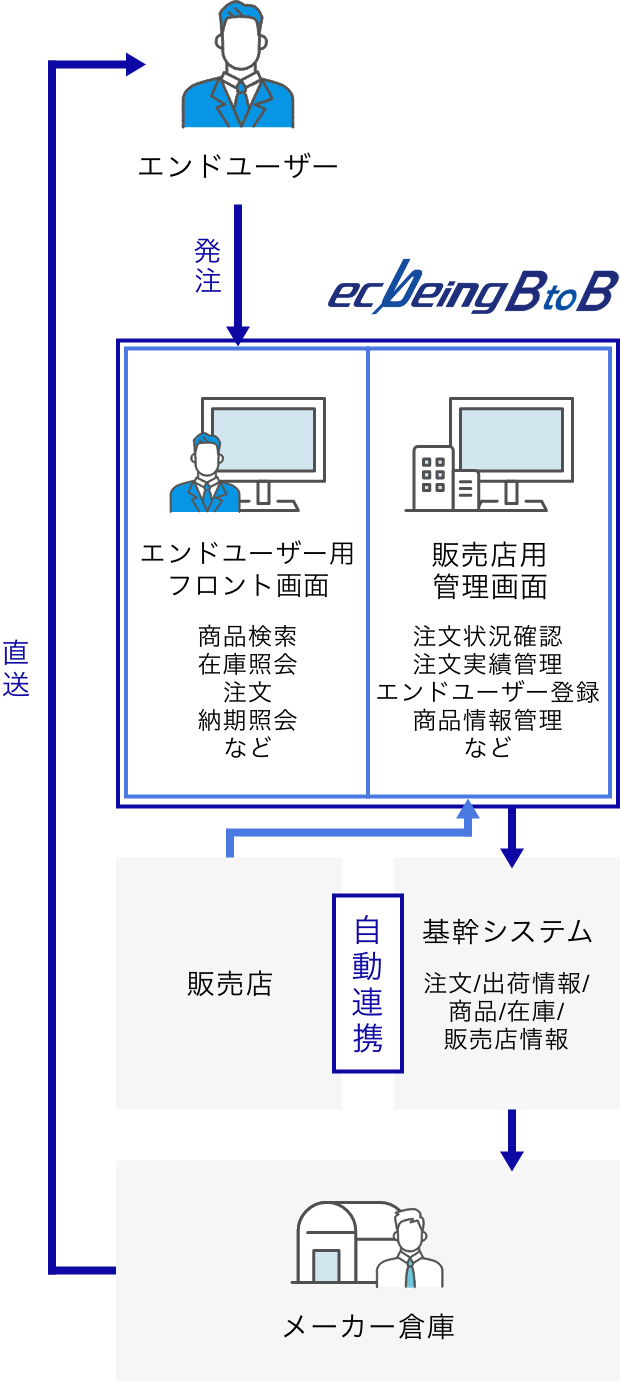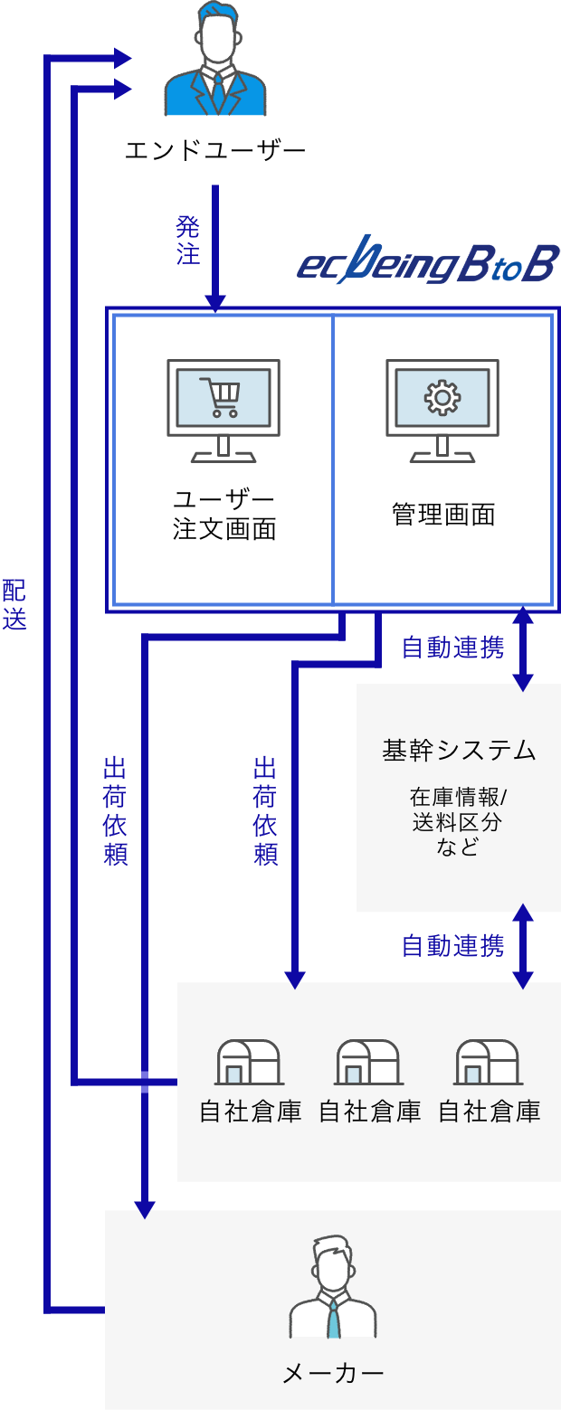 - 販売店がBtoB EC上で受注時、自動でメーカー倉庫から商品を直送