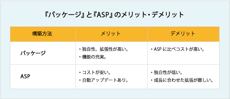 パッケージとASPの大きな違いは自社のために独自構築するのか、共通のものを利用(レンタル)するのか?という点です。
