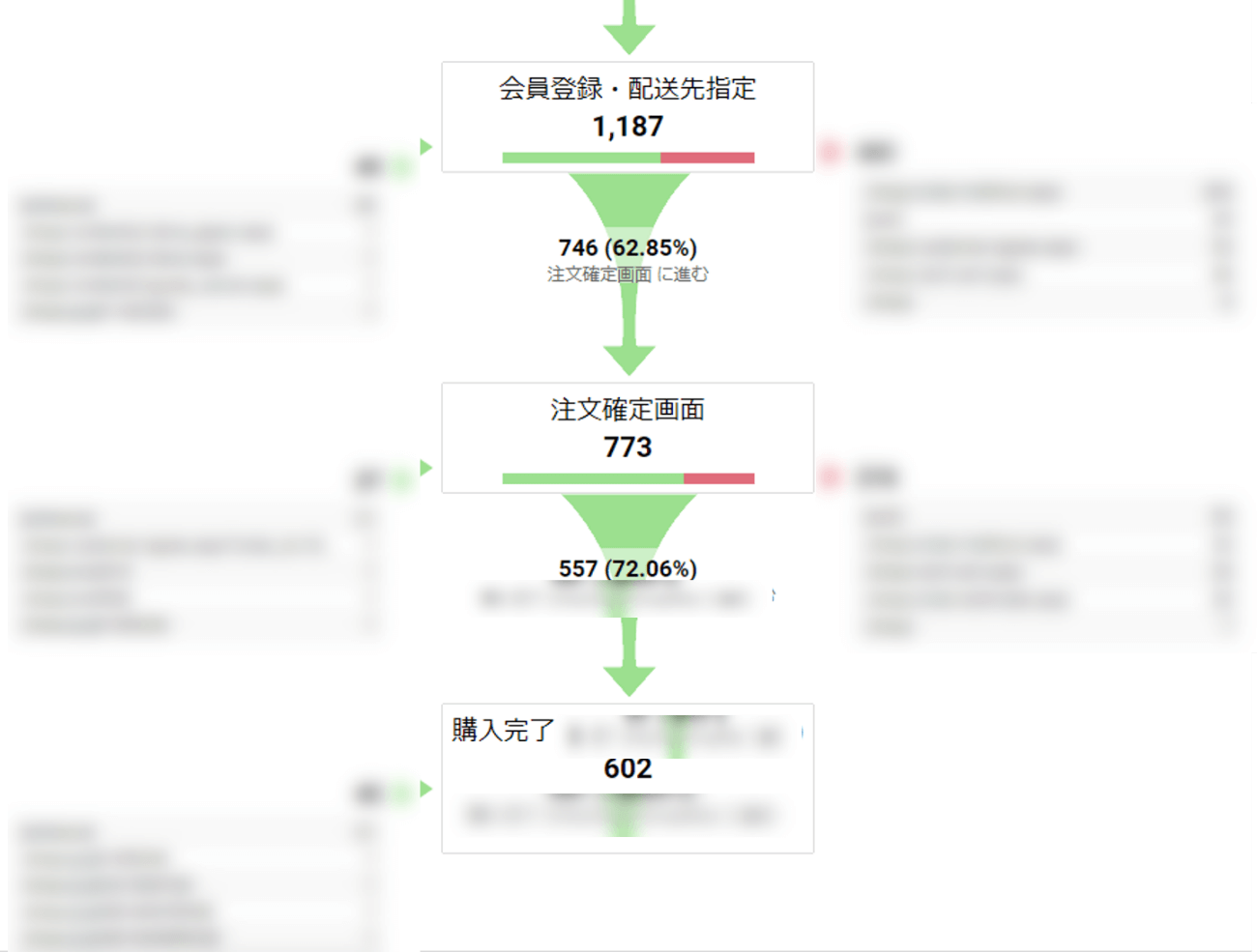 これでみると60%以上のユーザーが会員登録の画面で離脱していることがわかります。せっかく商品を購入しようとしているユーザーが離脱しているのは、非常にもったいないです。もしここの会員登録の次のフローまでいけば、商品を購入してくれたり、メルマガで有益な情報を発信できたり、今後の重要な顧客になり得る可能性もあります。