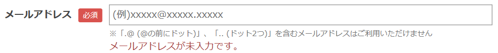 よく送信や決定などのボタンを押したあとにエラー表示で帰ってきてしまう場合もございますが、それだとユーザーとしてはさらに煩わしくなってしまいます。これらを行っているうちに離脱してしまうことも多いです。つまりリアルタイムでエラーの場所や内容を説明することで、少しでも効率的にすることが重要です。