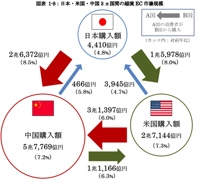 経済産業省のデータによると、越境EC市場はここ数年で成長を遂げています。例えば、2024年には世界の越境EC市場規模が310兆円と推計されており前年からも伸長、特にアメリカ、中国、日本の3国間の取引が大きな割合を占めています。