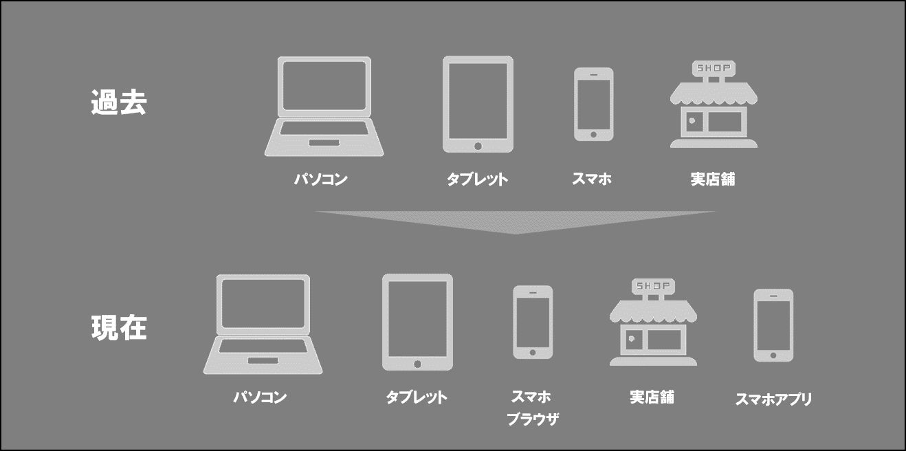 企業のオムニチャネル化が加速する中、今はチャネルの考えが変化しています。過去にはパソコン、タブレット、スマートフォン、実店舗と4つの販売チャネルと言われていましたが、現在はそれにアプリが加わり、時代は4チャネルから5チャネルの時代になっています。