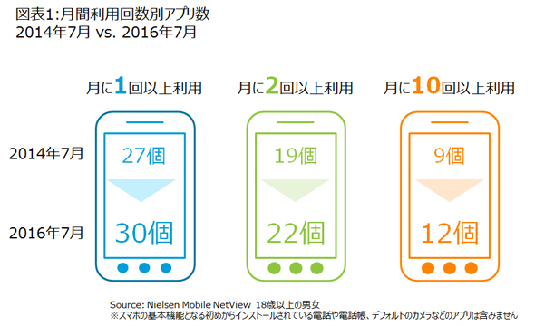 月に1回以上利用するアプリの個数は、2年前の27個から3個増加し30個となりました。また、月に2回以上利用するアプリは19個から22個、10回以上利用するアプリは9個から12個とそれぞれ3個ずつ利用数が増加しました。