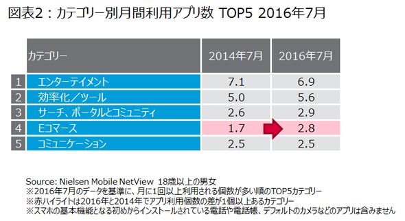1位はエンターテイメントカテゴリで、ゲームのアプリなどが該当します。利用個数はすべてのカテゴリーで微増となっているが、4位の「Eコマース」に関しては1.2個増加し、唯一1個以上増加したカテゴリーとなり、「ECアプリ」の利用率が急増しています。