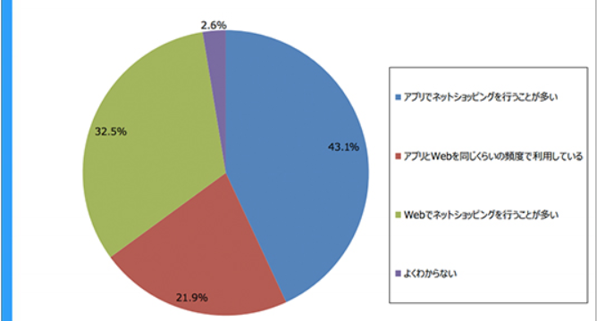 ECでショッピングをする際に、WebとECアプリのどちらを利用するかという調査では、43.1%の人が「アプリの方が多い」と回答し、32.5%の人が「Webの方が多い」という調査結果が発表されています。