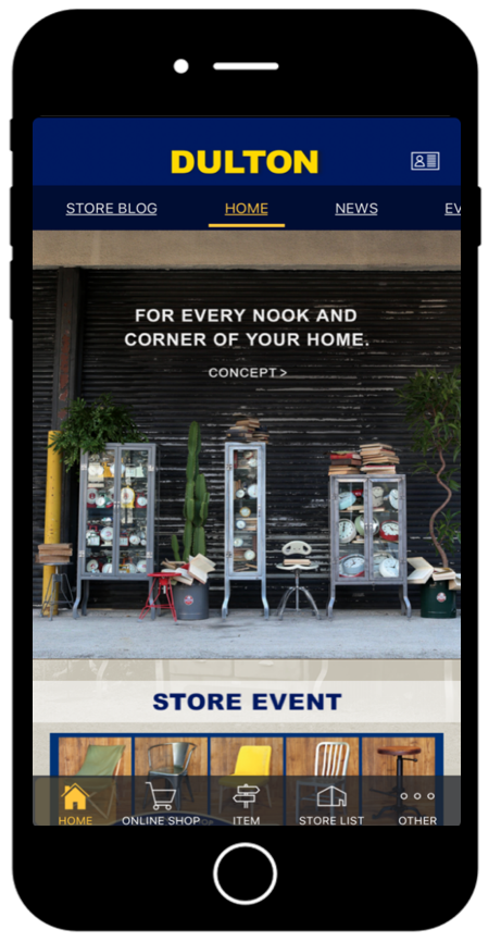 インテリア・雑貨メーカーの株式会社ダルトン様は2017年10月にECコンテンツ、会員カード機能、ブランドコンテンツ、お知らせ、店舗一覧、店舗ブログ、SNSをはじめとした公式アプリをリリースしました。