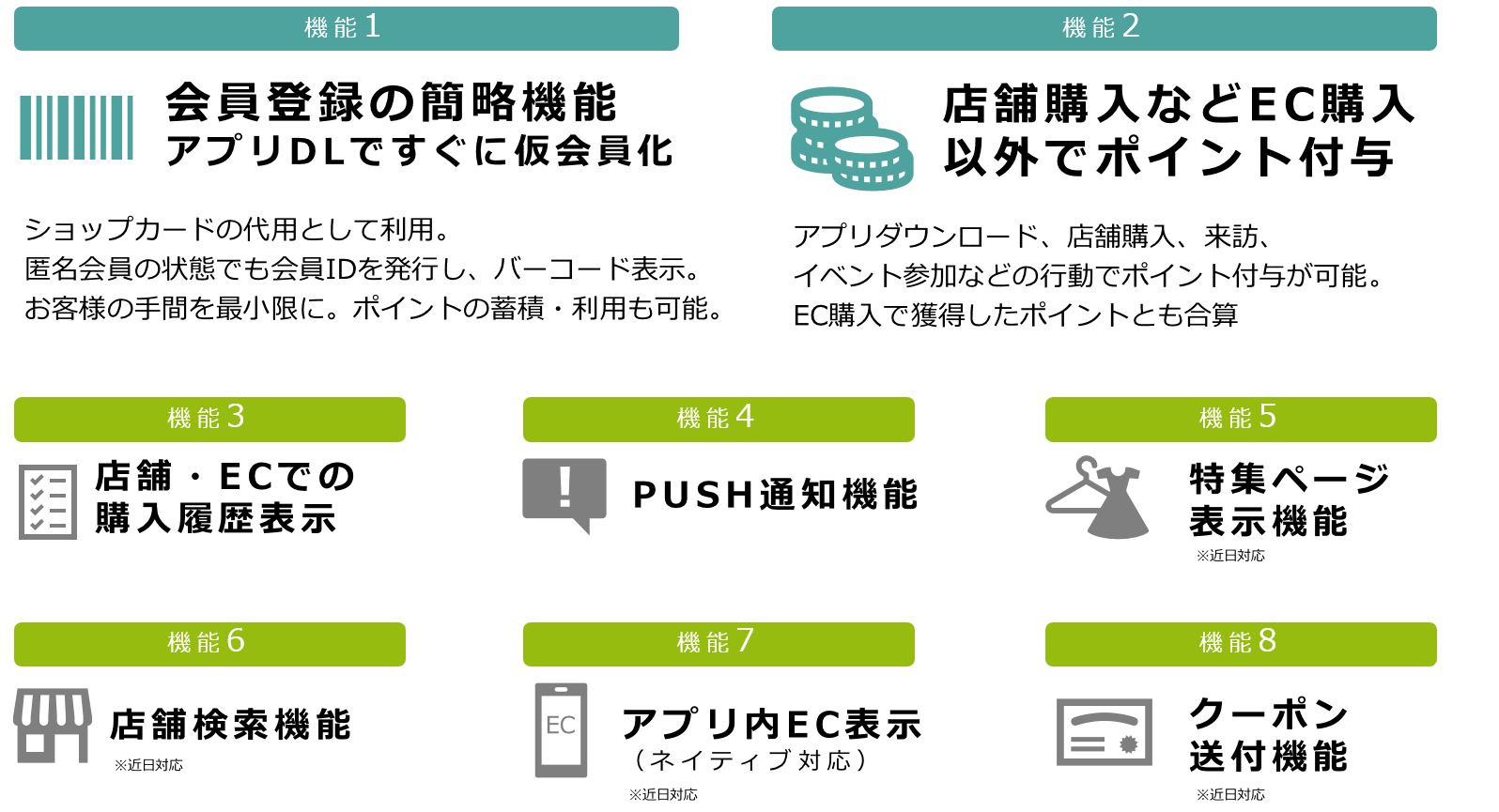EC会員との統合はもちろん、高いカスタマイズ性、アプリ内EC表示はネイティブ対応、さらには導入費用が低コスト。店舗・ECの売上を最大化できるECアプリです。