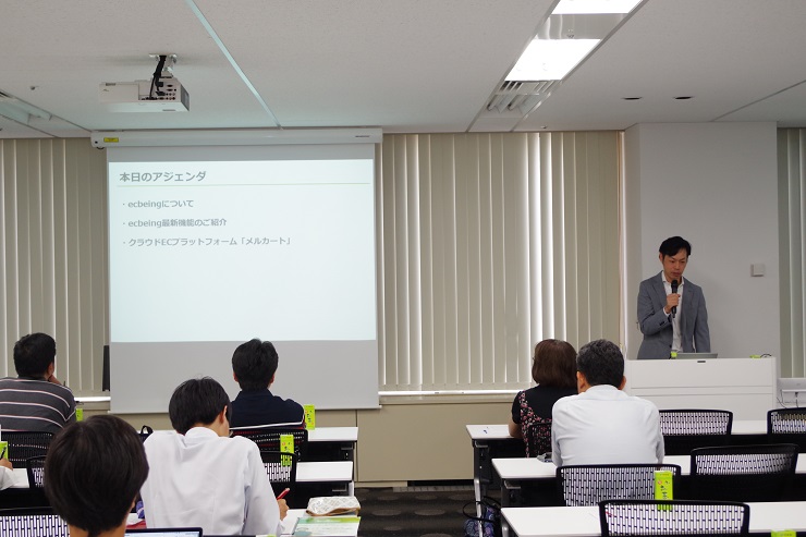 中堅・大手1100サイトの構築実績、10年連続ECパッケージシェアNo.1の実績のある『ecbeing』の新機能、クラウドECプラットフォーム『メルカート』についてデモンストレーションを交えながらのセミナーを行いました。