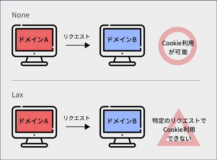 Noneの場合はECサイトに対し、別ドメインのサイトからどのようなリクエストがあっても、Cookieの利用が可能でしたが、Laxの場合はECサイトに対し、別ドメインのサイトからの特定のリクエストでCookieを使えない。という制限が発生します。