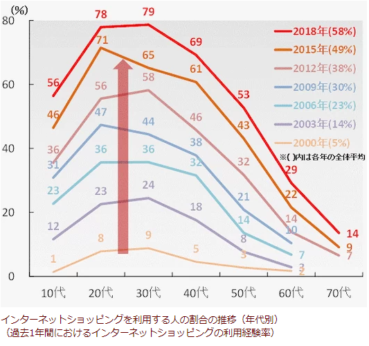 全体のインターネットショッピング利用率は、2015年の49%から2018年の58%へと大きく伸びています。