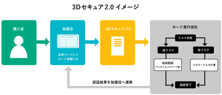 ワンタイムパスワードであれば固定のパスワードを覚える必要がないため忘れることがない上、セキュリティコードのようにクレジットカード本体が盗難に遭った際に不正利用されるリスクもありません。 また、3Dセキュア2.0ではリスクベース認証(なりすましを防ぐ認証技術)により、 リスクの高い取引のみに対して承認を要求することができるようになったため、ユーザーにとっての障壁が低くなりました。
