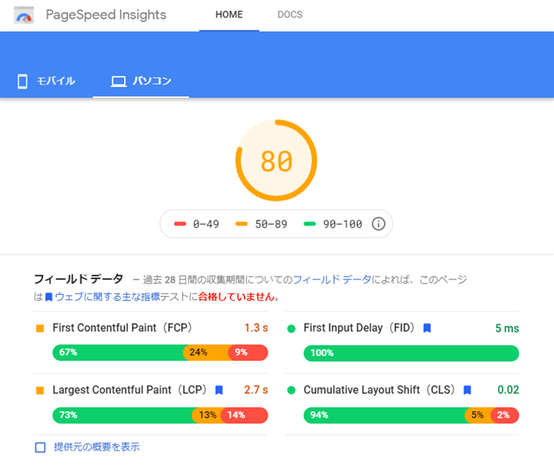 PageSpeed Insightsは、Lighthouseと同様にGoogleが提供する、監査(評価)ツールです。 モバイル端末やパソコン向けのページの実際のパフォーマンスに関するレポート、ページの改善方法を確認できます。