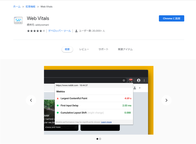 (参考:Web Vitals|chrome ウェブストアhttps://chrome.google.com/webstore/detail/web-vitals/ahfhijdlegdabablpippeagghigmibma)