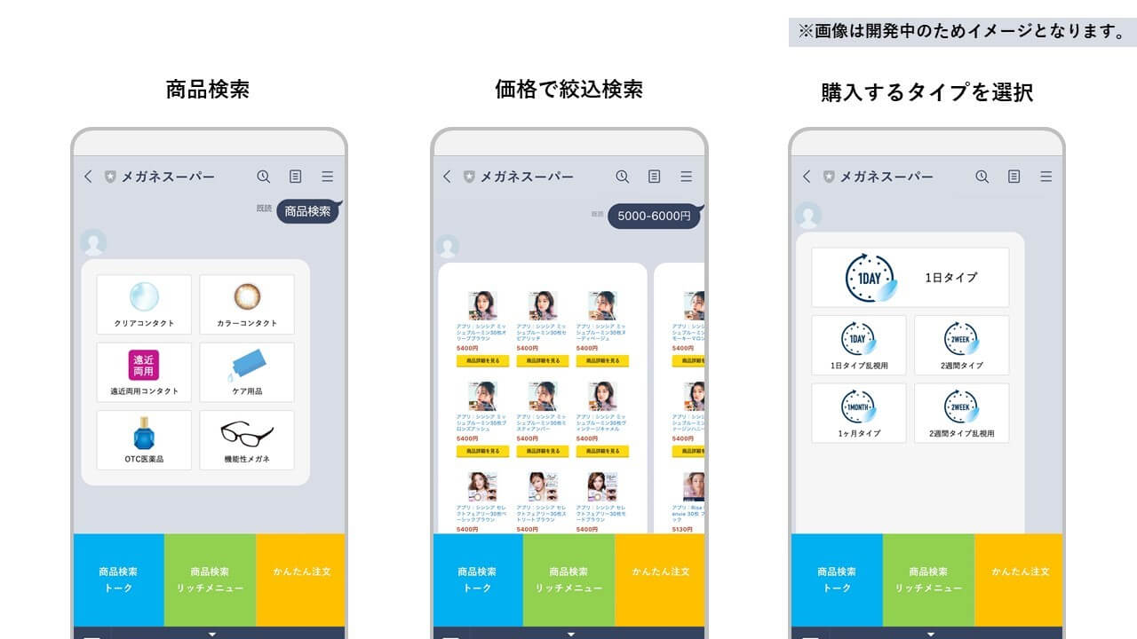 メガネスーパーをはじめとする同社グループの店舗・ECサイトでの購入履歴があれば、LINE公式アカウント内のリッチメッセージをタップするだけでLINE内にて注文が完結し、指定した住所に配送できるなど、LINEを活用した利便性の高い新サービスとなります。
