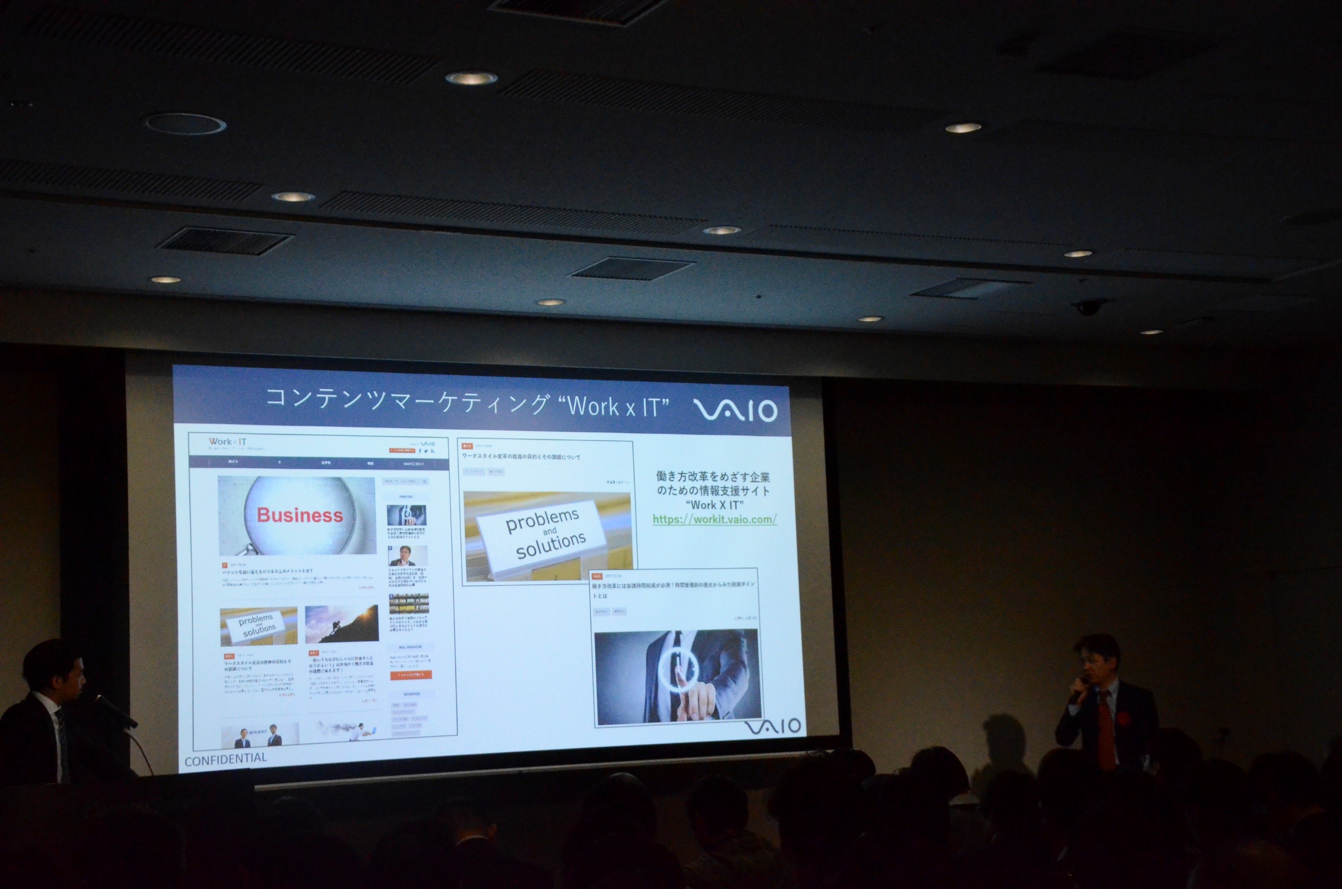 2014年7月にVAIO株式会社の設立、ECサイト及び技術営業部の立ち上げ、EMS事業の確立と営業活動を推進している花里氏にご登壇をいただき、モデレーターとして株式会社ecbeingの斉藤とのトークセッション形式でお送りさせていただきました。法人向けPCの販売台数が右肩上がりのVAIO社として、2015年にecbeingで立ち上げたECサイトを中心に法人強化の体制を確立。ECサイトと様々なマーケティングツールSFA〜MAと連携させ新規顧客の獲得からロングテール顧客への販促施策、VAIOとしてのコンテンツマーケティング施策などをお話いただきました。