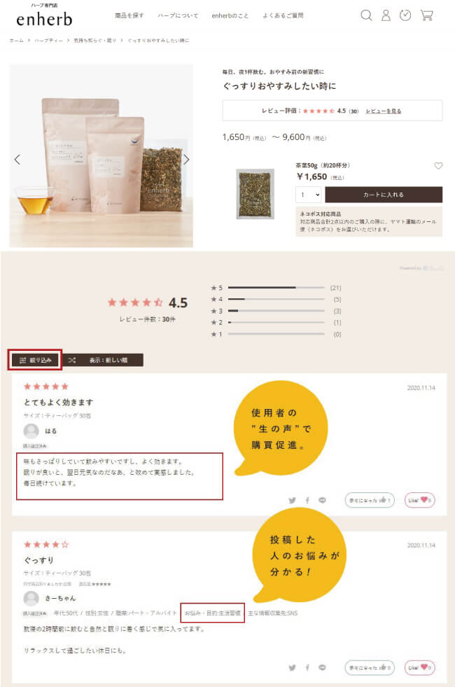 株式会社コネクトが運営するハーブ専門店「enherb」 商品の効果、体験結果を悩みや目的別レビューで収集 “ReviCo”活用で購買検討者に訴求・UGCの活用を強化へ