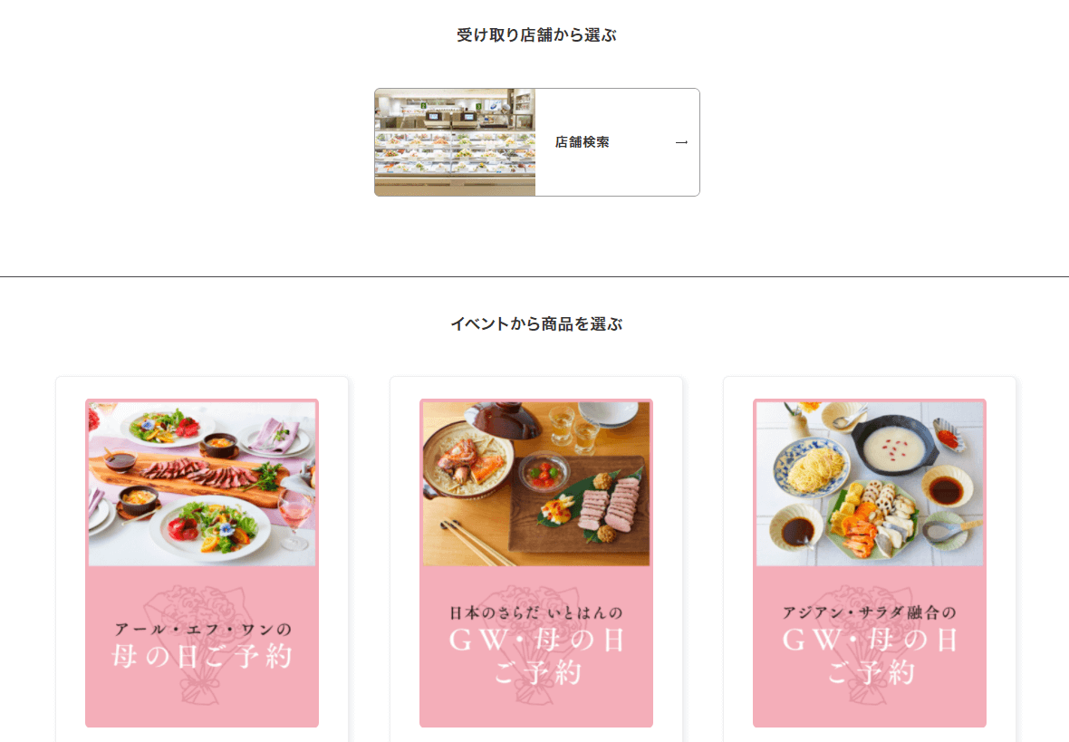 店頭では、お客様に商品カタログをお配りしており、カタログを見ながら商品を選んでいただき、予約サイトで予約をされるお客様が多いのですが、それとは別にもうすでに予約したい商品が決まっている、もしくは予約した商品を普段利用している店舗で受け取りたいというお客様のために、「品ぞろえから商品を選ぶ」と「受け取る店舗から商品を選ぶ」の2つの入口に分けることで商品を探しやすくしました。