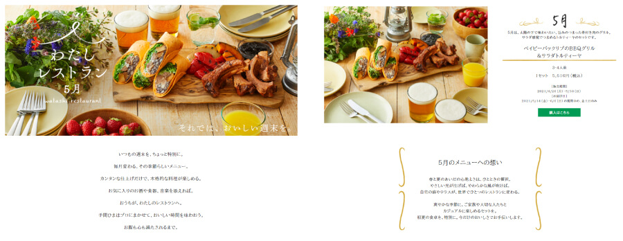その他、「わたしレストラン」という毎月、月替わりの食事を紹介している特集ページがあるのですが、メインの料理とサラダのセットを月替わりで紹介するというイベントをしています。すでにお客様から毎月楽しみにしているといったお褒めのお言葉をたくさん頂いており、以前のサイトではできなかったコンテンツを展開できるという点においても満足しています。