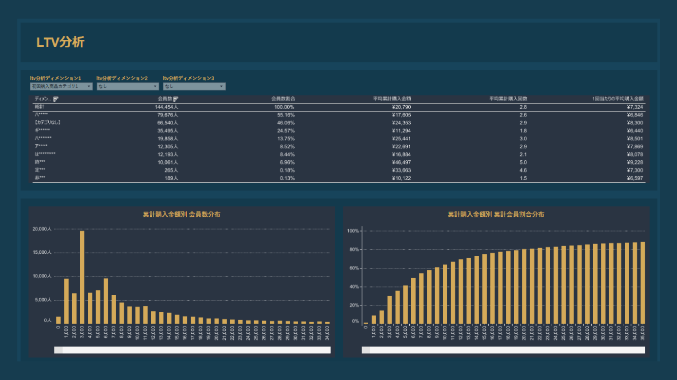 例えば、店舗とECを含めてF2購買しているお客様の見える化、LTVの状況、最近で言うと会員ランクの推移を見ています。特に会員ランクは、「ダイヤモンド」「ゴールド」「シルバー」の3つのランクに分かれており、一番上のダイヤモンド会員からからどれぐらい離反しているのかなど見ています。