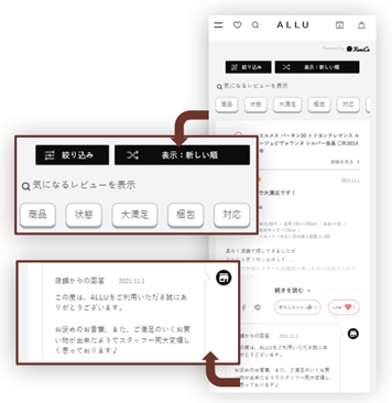 バリュエンスジャパン様が展開する1点ものリユースサイト「ALLU」。1点ものを取り扱うサイトでも「安心なサイト作り」を実現するためにReviCoを活用頂いております。