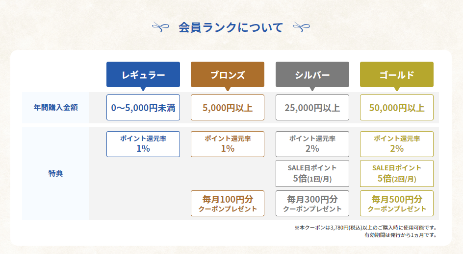 一般的なECサイト同様、本サイトにおいても会員ランクが存在します。(年間購入金額に合わせてレギュラー・ブランズ・シルバー・ゴールドの4段階)