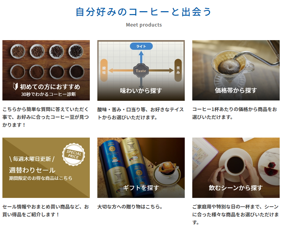 ご年配の既存ユーザーでも分かりやすく、TOPページには「味わい」「価格帯」「ギフト」「飲用シーン」など、目的別からすぐにイメージに合った商品を探せる導線を設置しています。