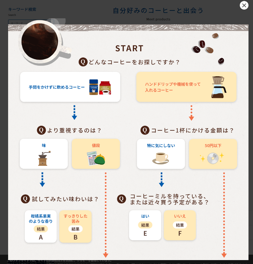 また、新規顧客のために、おすすめのコーヒーをチャート式でレコメンドできるコンテンツもご用意し、安心して購入いただける工夫をしています。