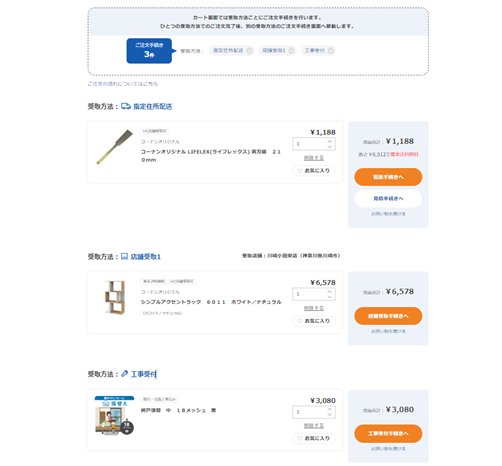 システム上、リニューアル以前は受取方法の異なる商品がそれぞれ別々のカートに投入される形でしたので、注文時に複数の受取方法が選択されている場合は同時に購入ができず、受取方法毎に商品をカート投入し手続きをしなければならない状態でした。