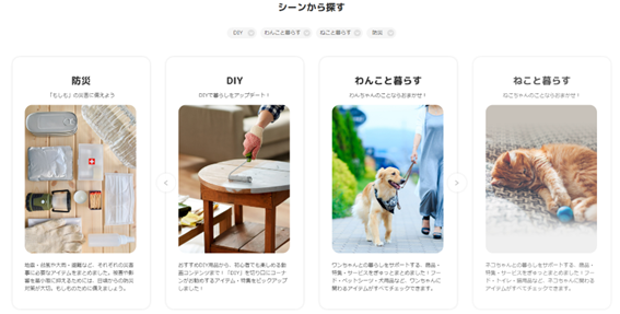 そういったお客様に対して「シーンから探す」という目的別のコンテンツ入り口を用意し、「最終的にこういう商品が必要になる」ということを伝えられるページを考えて作っています。ここに関しても強化を行っていき、様々な切り口からの商品購入を増やしていきたいです。