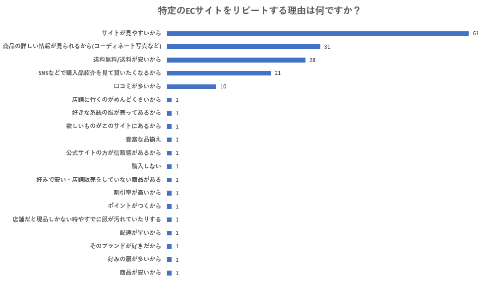 では、Z世代に選ばれているECサイトにはどんな共通点があるのでしょうか。アパレルサイトをリピートする理由についてのアンケートでは、次のような回答が得られました。
