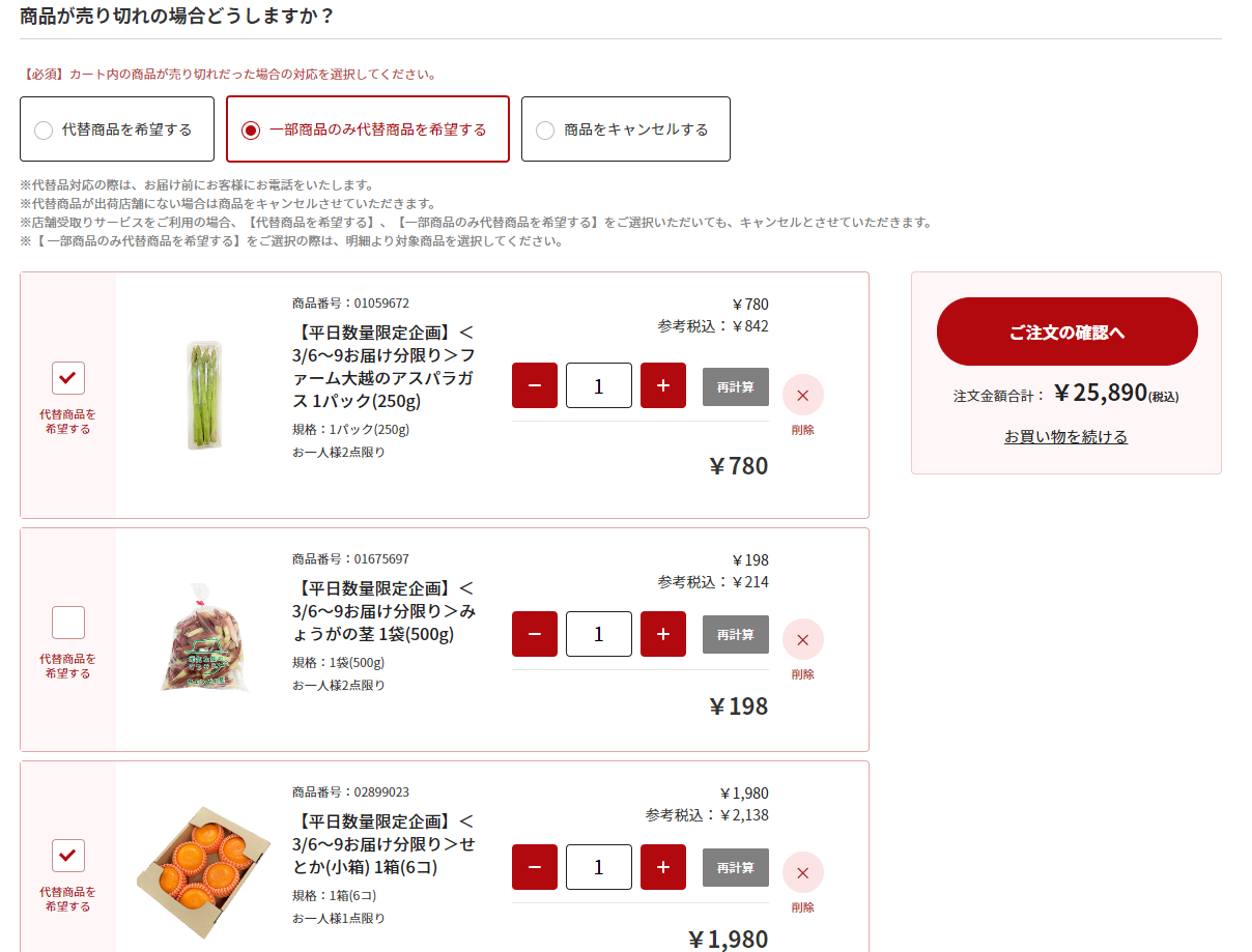 それが今回のリニューアルにより、商品欠品時の対応として「代替商品を希望する」「一部商品のみ代替商品を希望する」「商品をキャンセルする」といった選択を商品単位でお客さまがあらかじめ設定できるようになったことで、お客さまのより細かいご希望にお答えする事が可能になり、スムーズな買い物体験を実現できました。