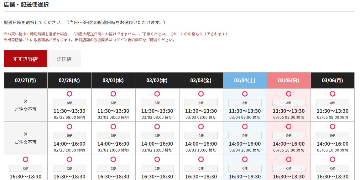 「東急ストアネットスーパー」は購入した商品が指定した店舗から配送されることに加え、店舗ごとに取扱商品が異なるため、購入する商品をカートに入れる前にお客さまに店舗・配送便を選択していただく仕様になっています。