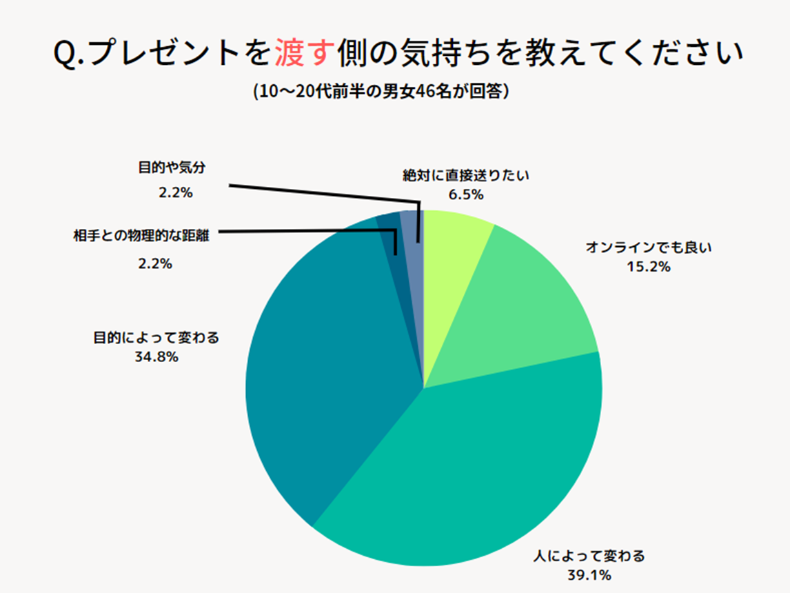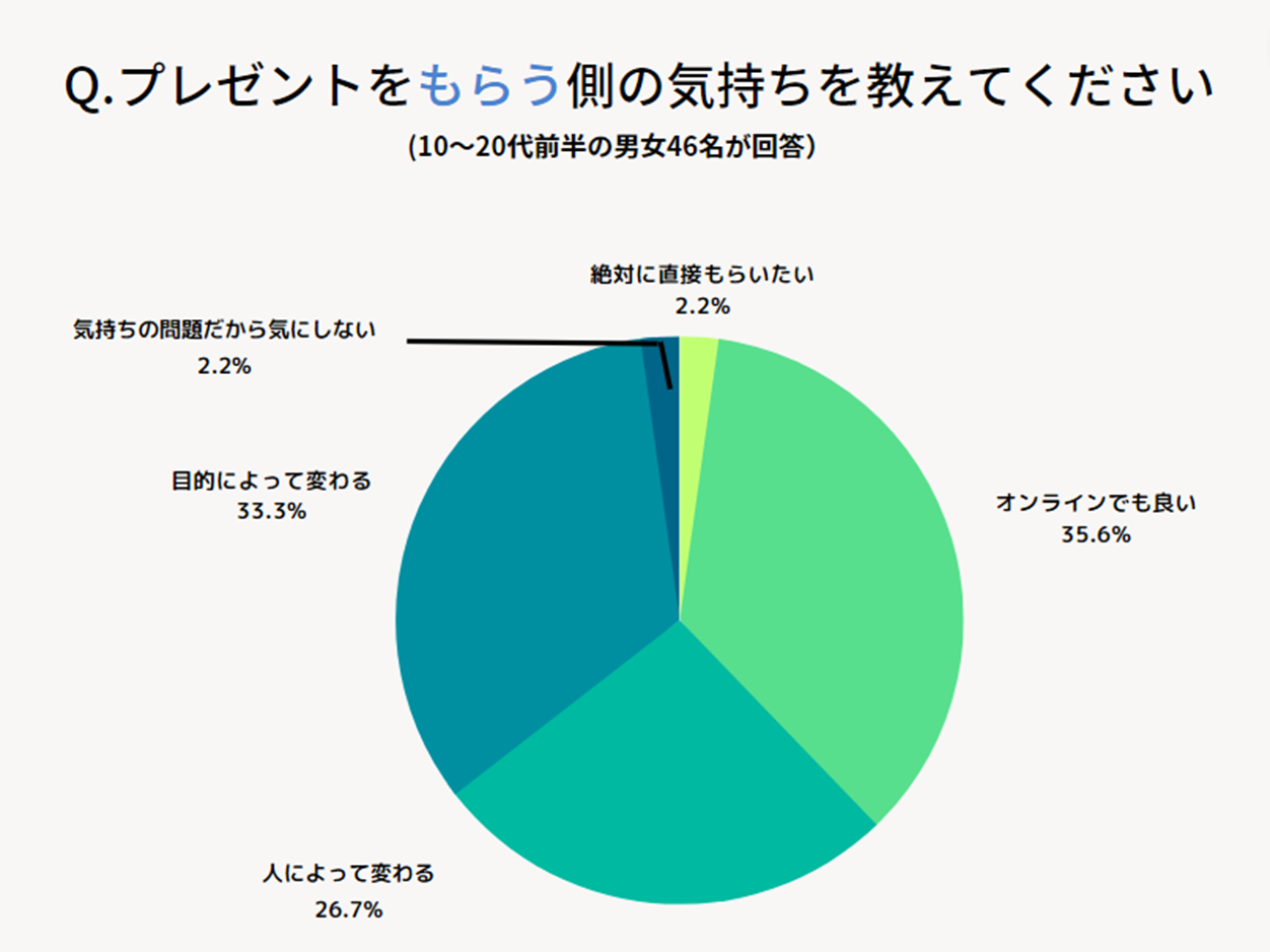 Z世代46人に、独自に聞いたアンケ―トでは、プレゼントを渡す側と貰う側の気持ちについての質問をしたところ、渡す立場になったときも、貰う立場になったときも、どちらも「状況に応じて変わる」と回答したのが60%以上を超えていることがわかりました。また、貰う立場になったときのほうがより、「オンラインでもらうでも良い」と回答した方が多いこともわかりました。